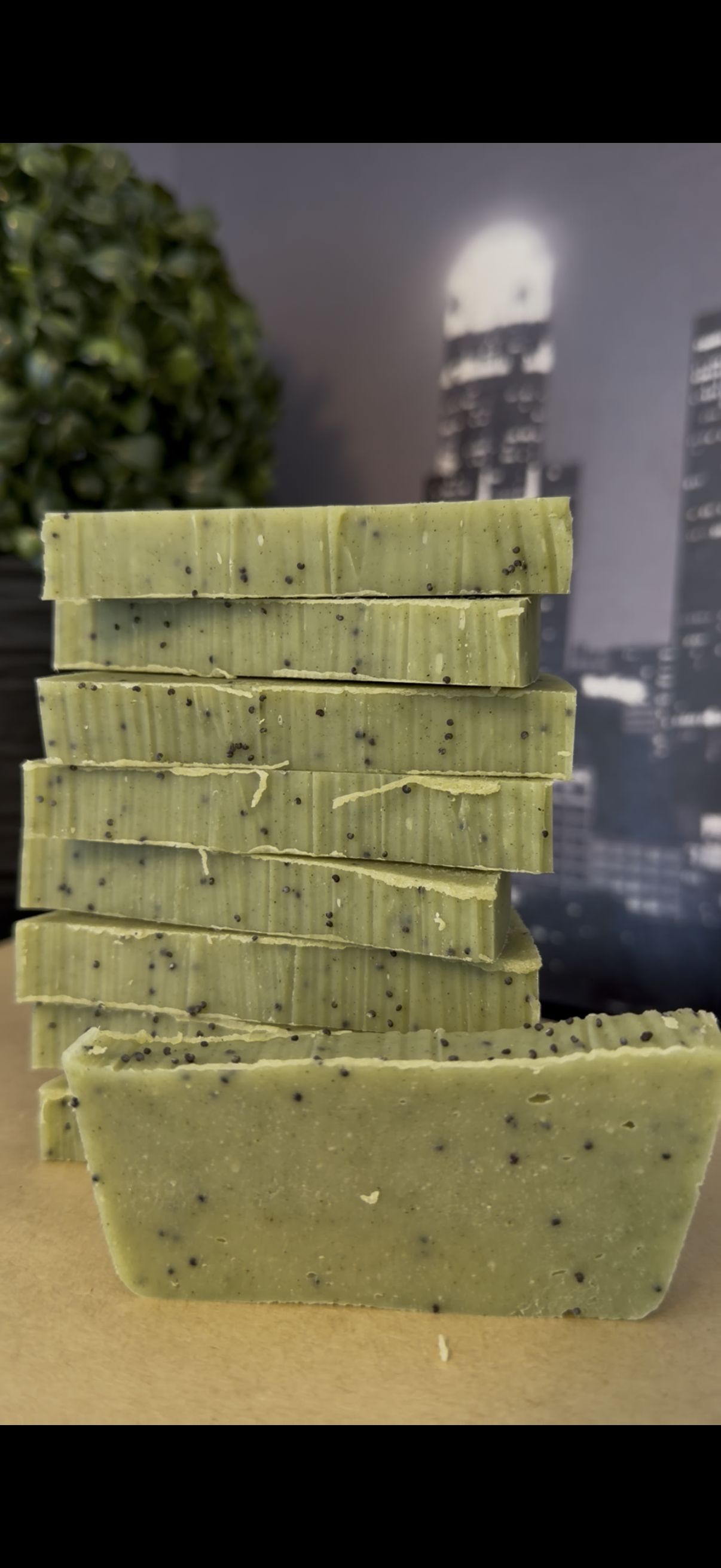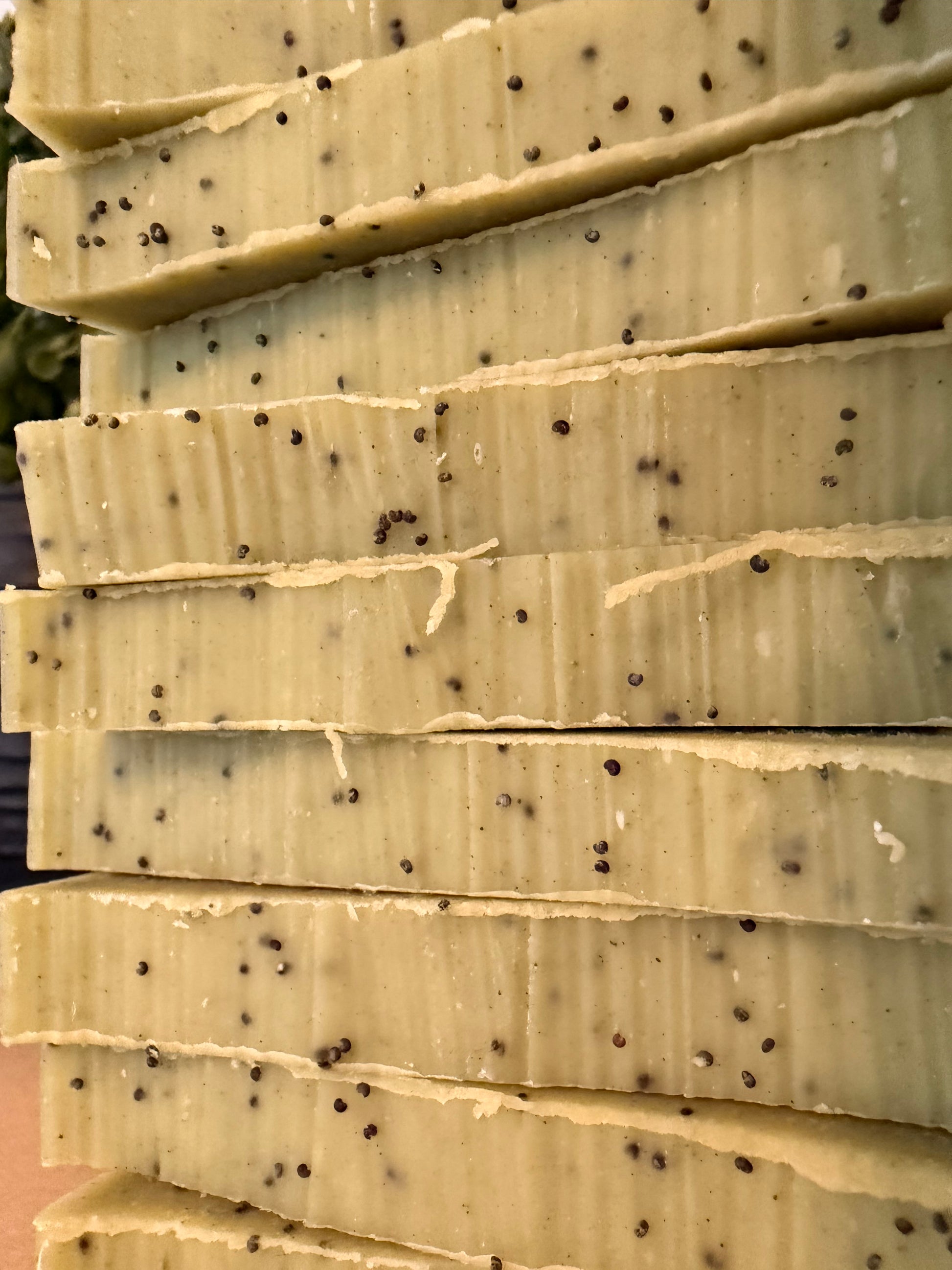 Goat Milk, Avocado Oil, Castor Oil, Coconut Oil, Hemp Seed Oil, Shea Butter, Olive Oil, Sodium Hydroxide (Lye – used for saponification), Spirulina, Poppy Seeds, Essential Oils of Eucalyptus, Patchouli & Tea Tree.